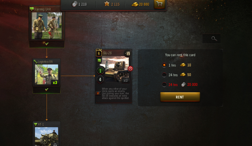 WoTGはカードの種類が何百もあるわけではなく、各HQに8種類のカードがあるだけで、このうち2枚ずつ、つまり全カード中1/4がレンタル専用カードという状態。この馬鹿げた割合のレンタルカード達によってこれらのカードを使わないデッキ構築が難しいだけでなく、そもそもいろいろ使えないのは面白くないという救いようのない状態になっている。