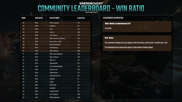 一戦ごとにどれだけのダメージおよび回復量を出しているか。これはWoTから来たプレイヤなら一番気なるところだと思うし実際価値がないわけではないんだけど、ゲームデザインが全く異なる点は抑えておきたい。10万ダメージの1killより6万ダメージの2killのほうが価値があるし、回復とリスポがあるために長期戦になればなるほどダメージとヒールの数字が跳ね上がる。逆に、さくっと勝ってる事が多いと上がりにくいわけだ。ダメージとヒールで別集計なのも価値の微妙さに拍車をかけてて、どっちもやってるプレイヤはさっぱり報われないんだよね。90%勝ってるやつがこっちには名前もでてこないんだから。