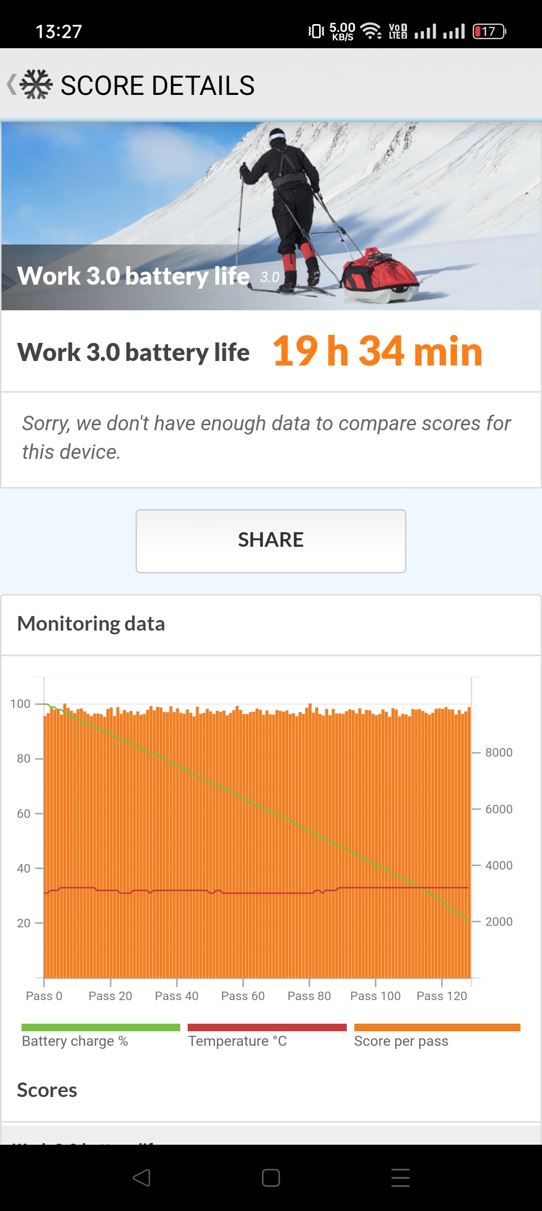 本機を選択した理由はGSM Arenaの評価でバッテリーのスコアが非常に高く、実使用で期待できるというのが理由の一つだった。タフネススマホとかスペックを捨てたミッドローを除いた、ある程度以上の性能をもった端末の中では素晴らしい数字。それで、じゃあ実機ではどうなのか、ということでPC Mark for Androidのバッテリーテストを行った。